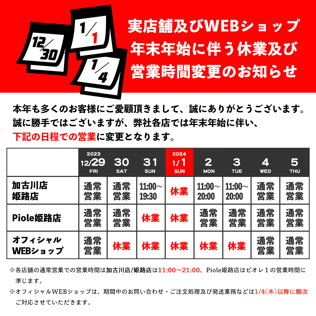 年末年始に伴う休業及び営業時間変更のお知らせ