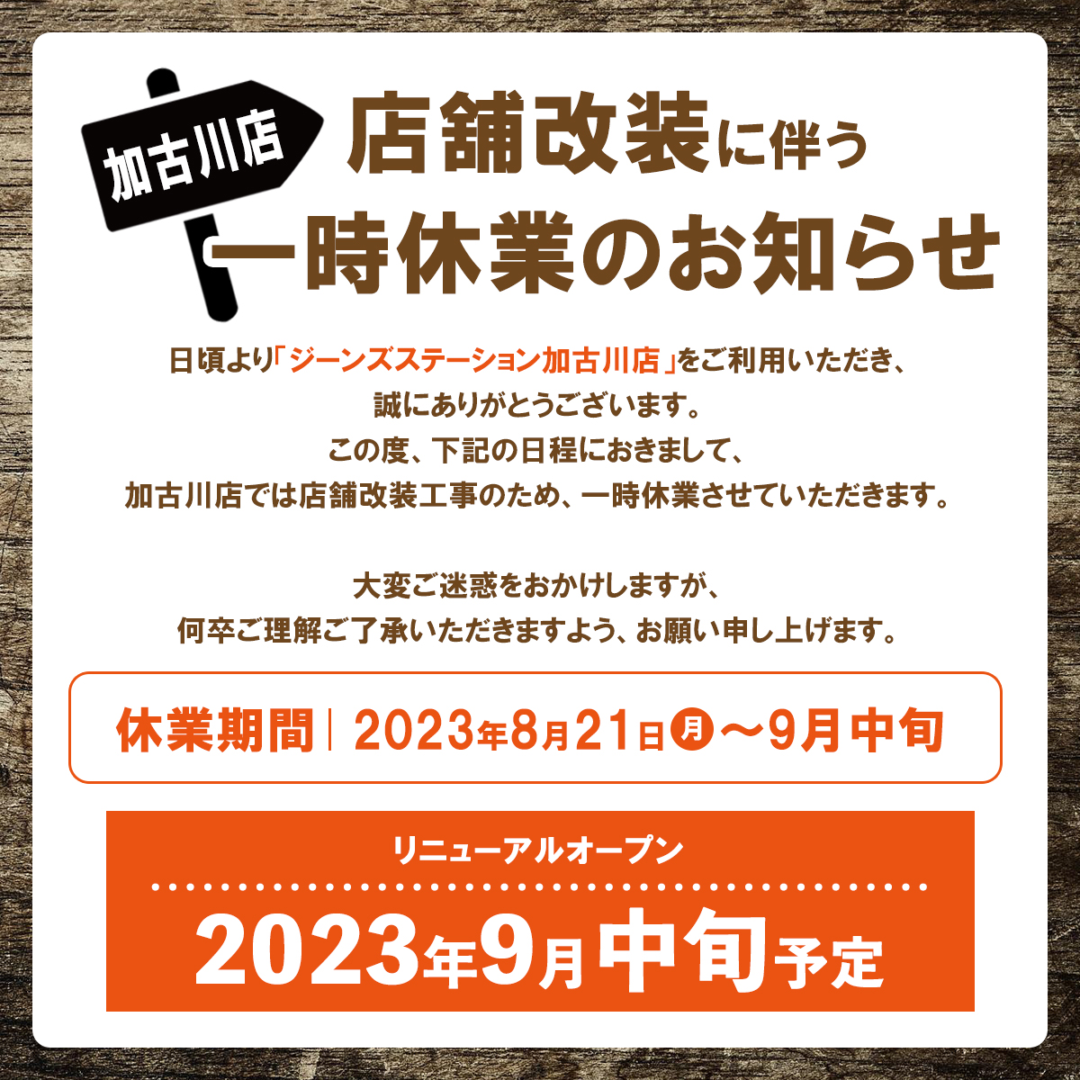 加古川店 改装工事に伴う一時休業のお知らせ