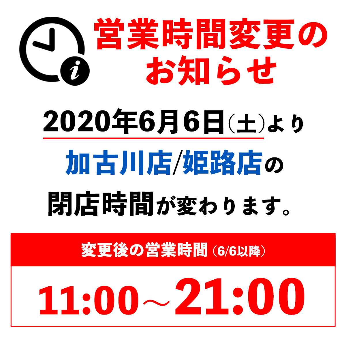 日頃は当店ジーンズステーションをご利用いただき、誠にありがとうございます。 誠に勝手ではございますが、2020年6月6日(土)より、加古川店/姫路店の営業時間を下記の通り変更させていただきます。引き続きご愛顧のほど、よろしくお願いいたします。 2020年6月6日(木)〜 営業時間:11:00〜21:00 【対象店舗】 ジーンズステーション加古川店/姫路店 ※姫路北店は20時閉店となります。 ※ピオレ姫路店はPiole姫路の営業時間に準じます。