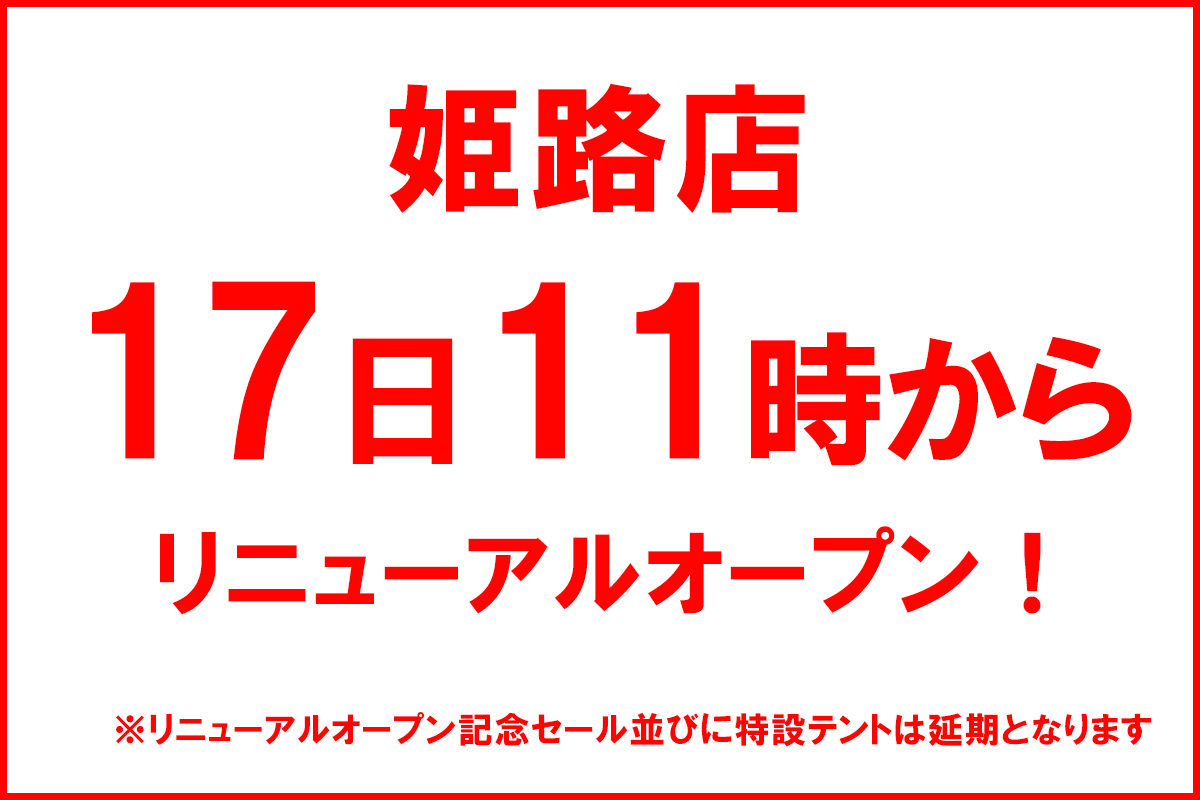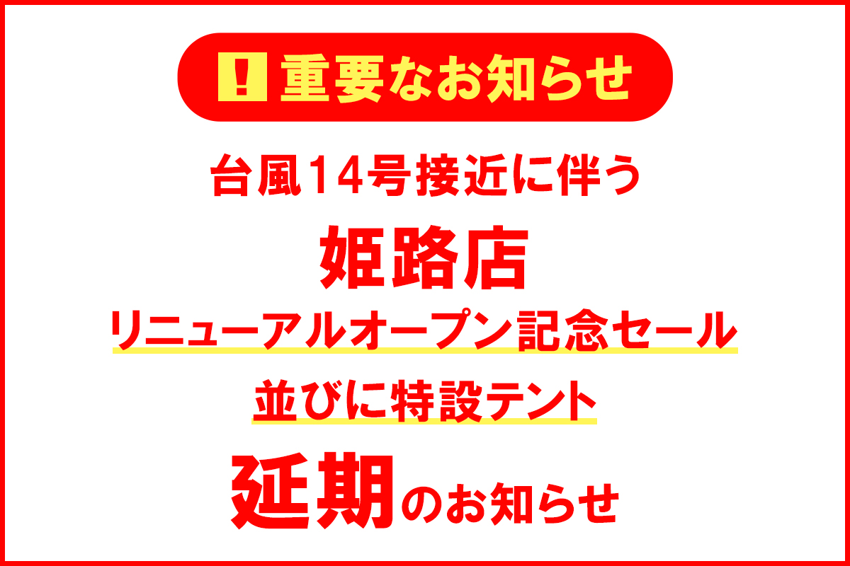 9月17日(土)から開催を予定しておりました「姫路店 リニューアルオープン記念セール並びに特設テント」は期間中の台風14号の接近が予測されており、お客様の安全を考慮いたしました結果、やむなく9月23日(金)から25日(日)に延期とさせて頂きます。