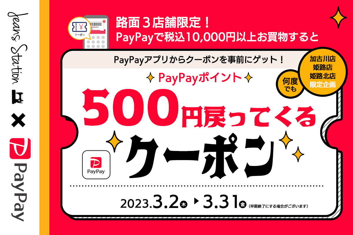 3月2日からの期間中、ジーンズステーション路面3店舗でPayPay支払いで、税込10,000円以上お買物すると、500円相当のPayPayポイントが戻ってきます。しかも期間中、何度も使えるお得なクーポン!