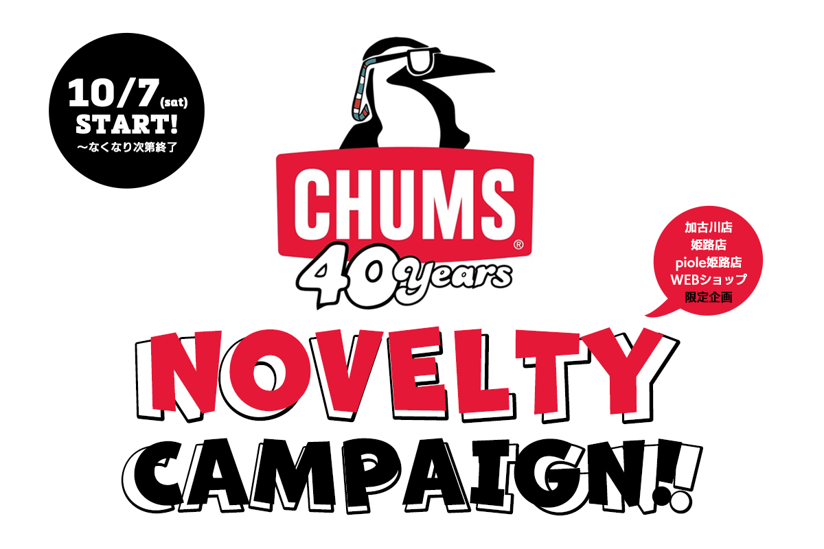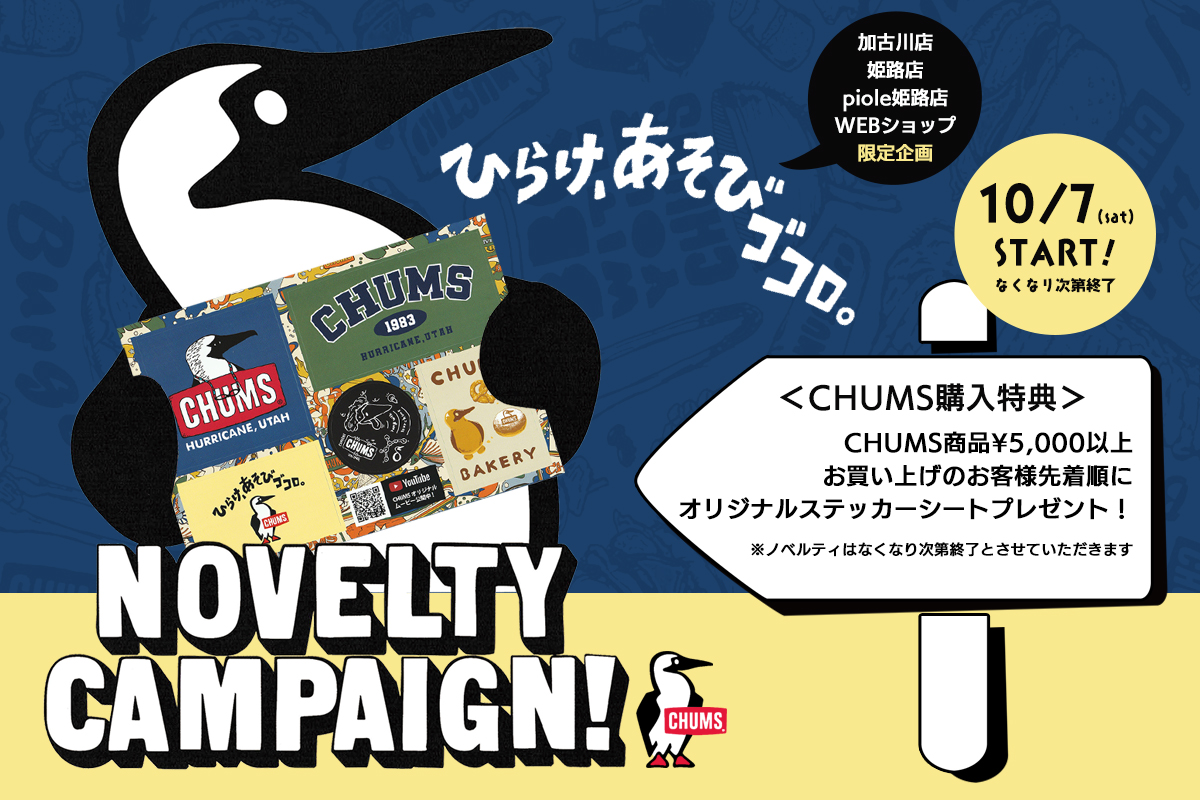 10月7日(土)より、ジーンズステーション各店にて「CHUMSオリジナルグッズ」がもらえるノベルティフェアを実施致します。各ノベルティは各店数量限定ですので、ぜひお早めにお越しください。