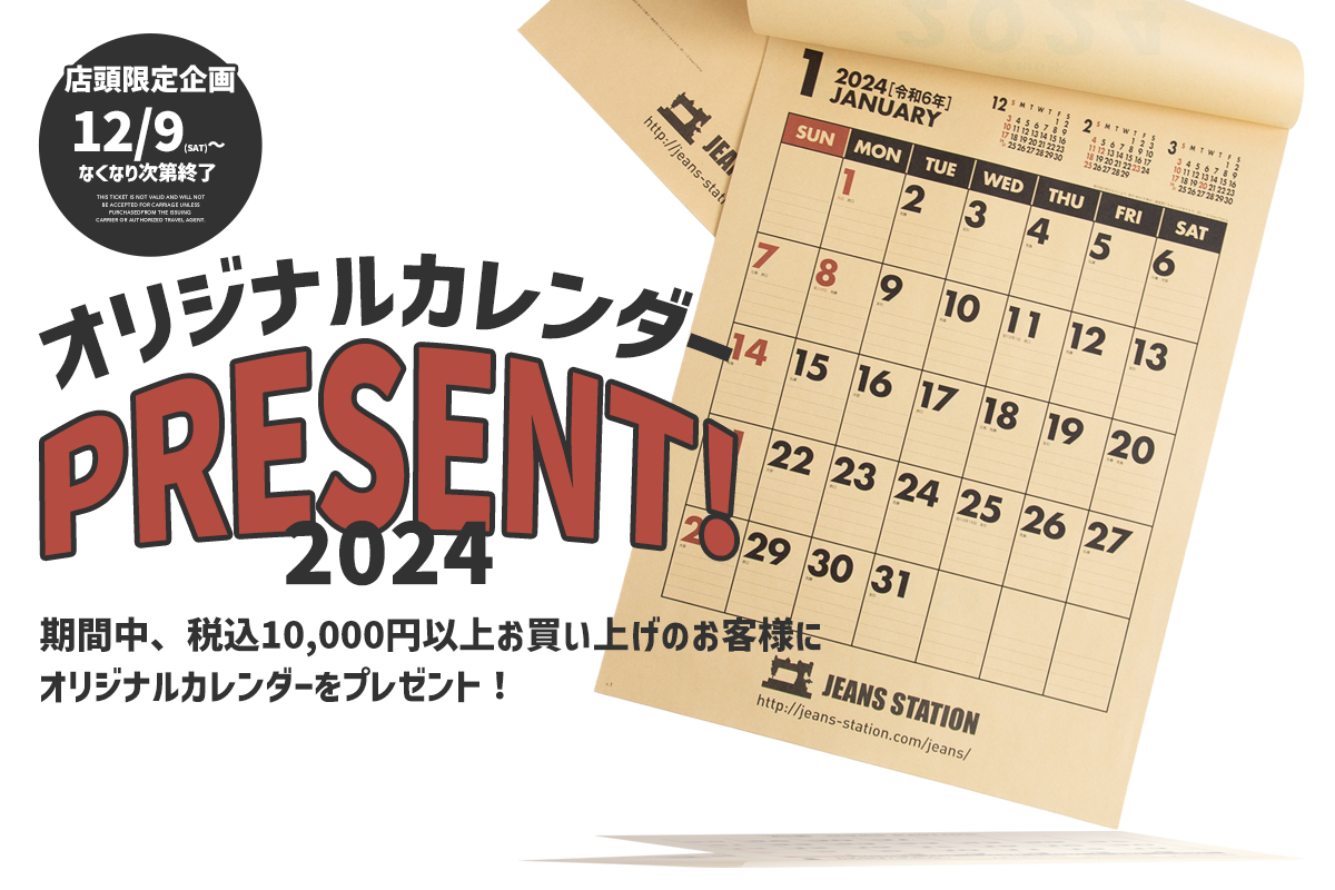 今年も残すところ、いよいよ1ヶ月を切りました。年末の当店の風物詩、JEANS STATION特製カレンダーの新年度版が今年も完成しました。そこで、12月9日(土)からジーンズステーション各店で10,000円(税込)以上お買い上げのお客様先着順に、<JEANS STATION特製2024年カレンダー>をプレゼント。カレンダーは数量限定となります。なくなり次第終了となりますので、ぜひお早めに。