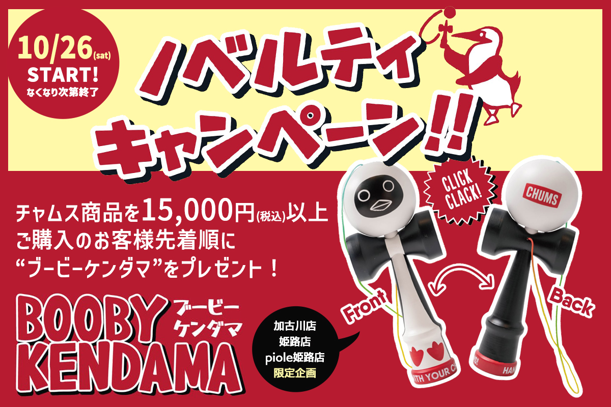 10月26日(土)より、加古川店・姫路店・Piole姫路店の3店舗で、CHUMS商品を15,000円(税込)以上ご購入のお客様先着順にプレゼントします。非売品のノベルティ、数に限りがございますので、GETしたい方はぜひお早めに!