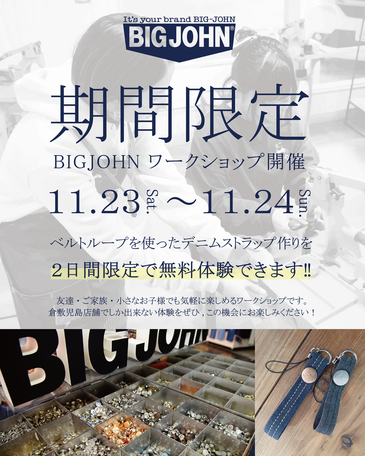 また同日、加古川店では、日本で初めてジーンズを国産で生産したブランドとして知られる「BIG-JOHN/ビッグジョン」のワークショップを同時開催!11月23日(土/祝)・24日(日)の2日間限定でベルトループを使ったデニムストラップ作りを無料体験出来ます。