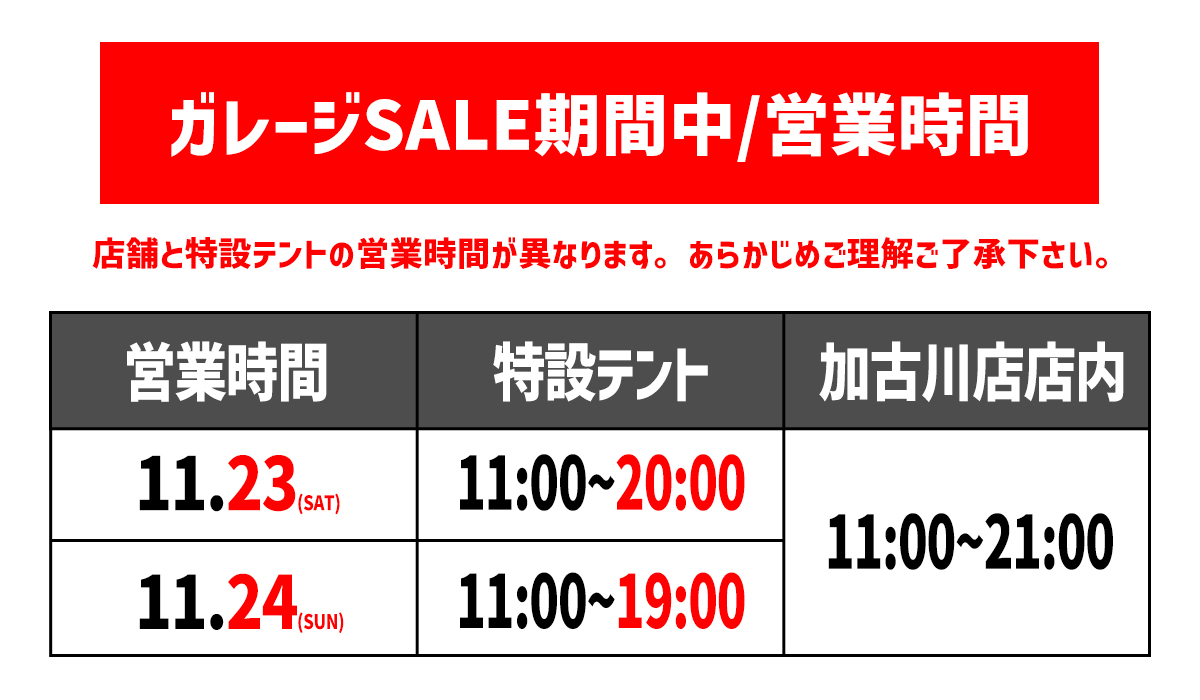 ※加古川店店舗の営業時間は全日程11:00〜21:00となります。