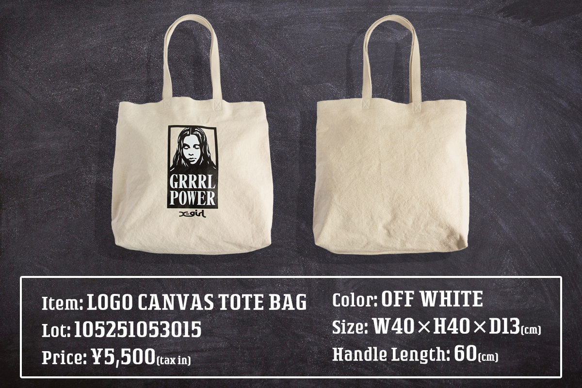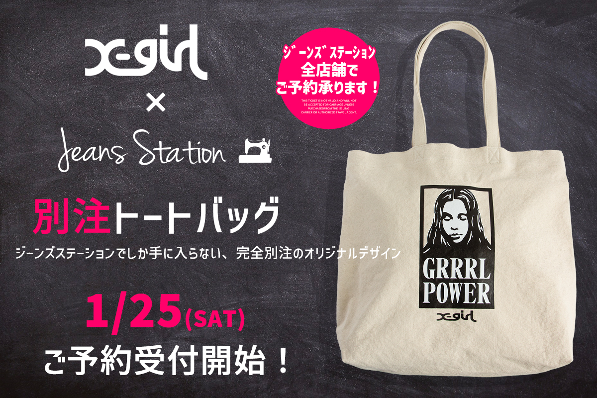 今回、そんな「X-girl」との別注が実現しました。X-girlとジンズステーションの「別注トートバッグ」。別注でしか使われないFACEロゴグラフィックをプリント。A4サイズがすっぽり入るサイズで、通勤通学や旅行・イベントにもおすすめ。カジュアルなデザインで、ストリートスタイルにはもちろん幅広いコーディネートにマッチします。