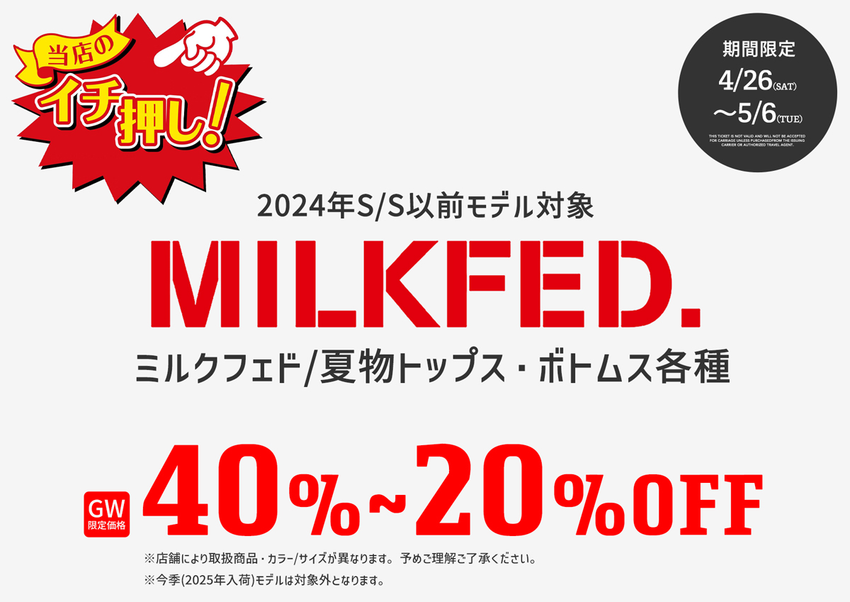 90年代、カジュアル女子を中心に人気を博し、今もなおストリートシーンで寝強い人気を誇る、カリフォルニア発のレディースブランド「MILKFED./ミルクフェド」の夏物トップス・ボトムスがGW期間中、特別価格に!
