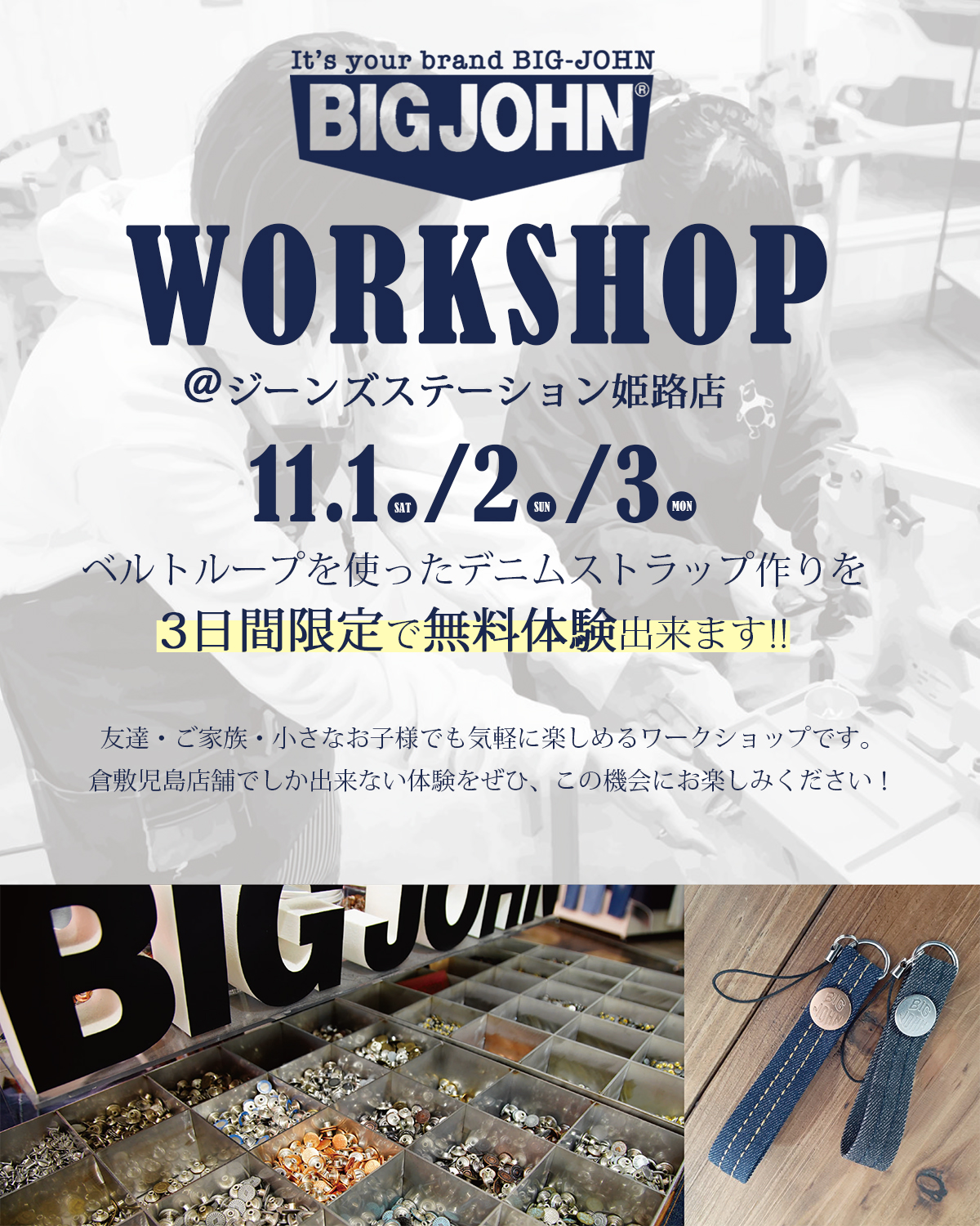 また同日、姫路店では、日本で初めてジーンズを国産で生産したブランドとして知られる「BIG-JOHN/ビッグジョン」のワークショップを同時開催!11月1日(土)・2日(日)・3日(月/祝)の3日間限定でベルトループを使ったデニムストラップ作りを無料体験出来ます。