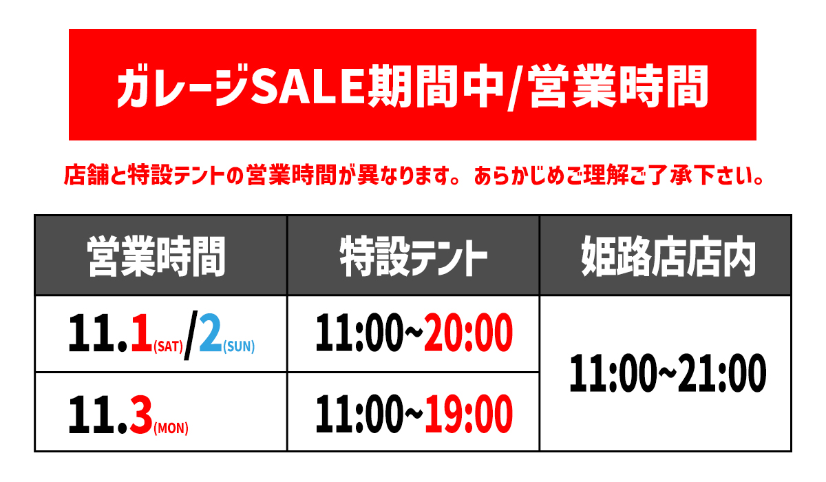 ※姫路店舗の営業時間は全日程11:00~21:00となります。