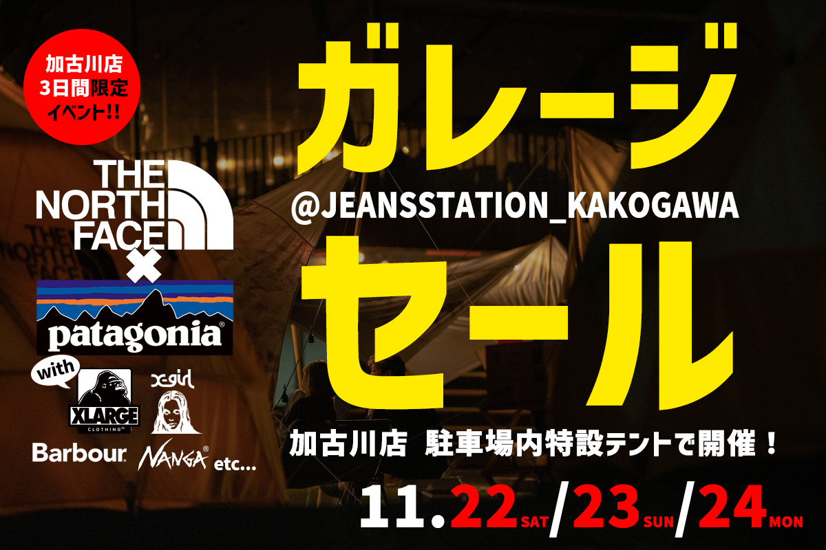 来たる11月22日(土)・23日(日)・24日(月/祝)の3日間、加古川店で「THE NORTH FACE」と「patagonia」をメインにしたガレージSALEを開催します。