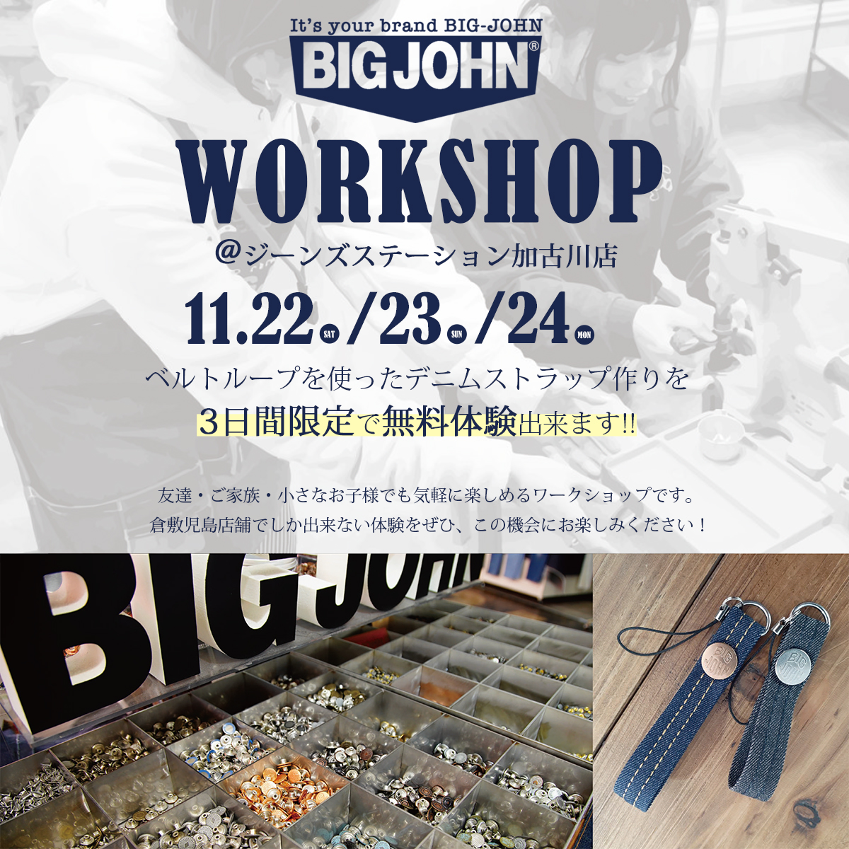 また同日、加古川店では、日本で初めてジーンズを国産で生産したブランドとして知られる「BIG-JOHN/ビッグジョン」のワークショップを同時開催!