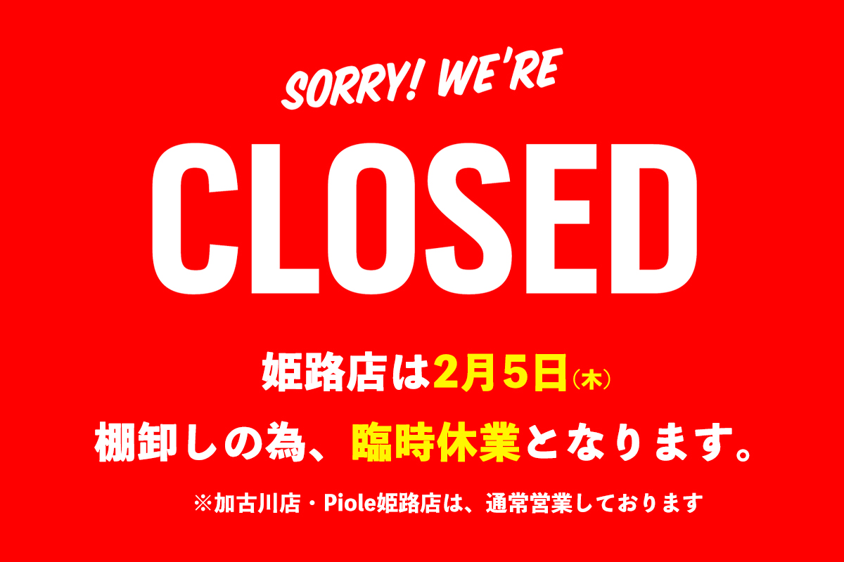 日頃よりJEANS STATIONをご愛顧いただき、誠にありがとうございます。 誠に勝手ではございますが、姫路店は2月5日(木)は棚卸の為、臨時休業となります。 ご迷惑をおかけいたしますが、ご理解ご了承のほど、よろしくお願いいたします。 尚、加古川店・Piole姫路店は通常営業となります。