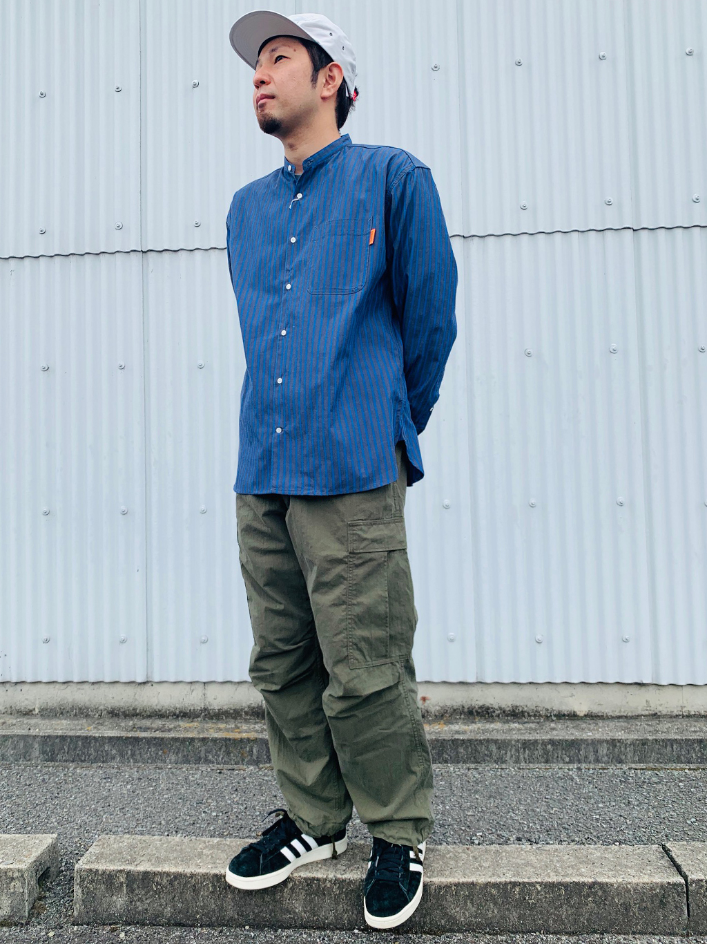 ▼【UNIVERSAL OVERALL】ストライプノーカラーシャツ